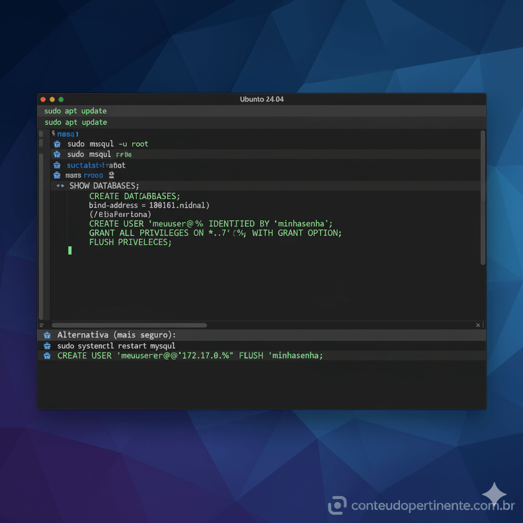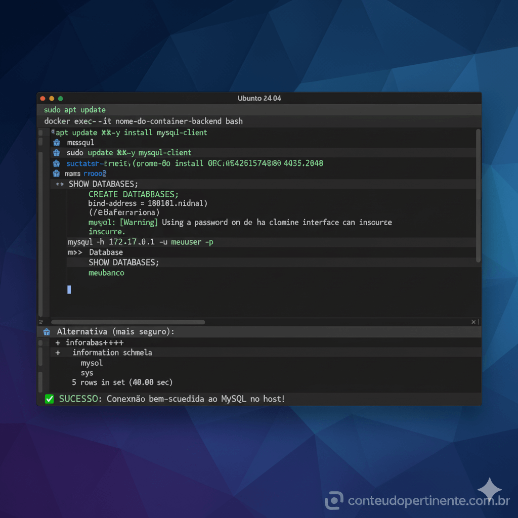 Se a conexão for bem-sucedida e você for solicitado a inserir a senha, parabéns! Seu MySQL no host Ubuntu 24.04 está agora totalmente acessível e configurado para seus containers Docker.